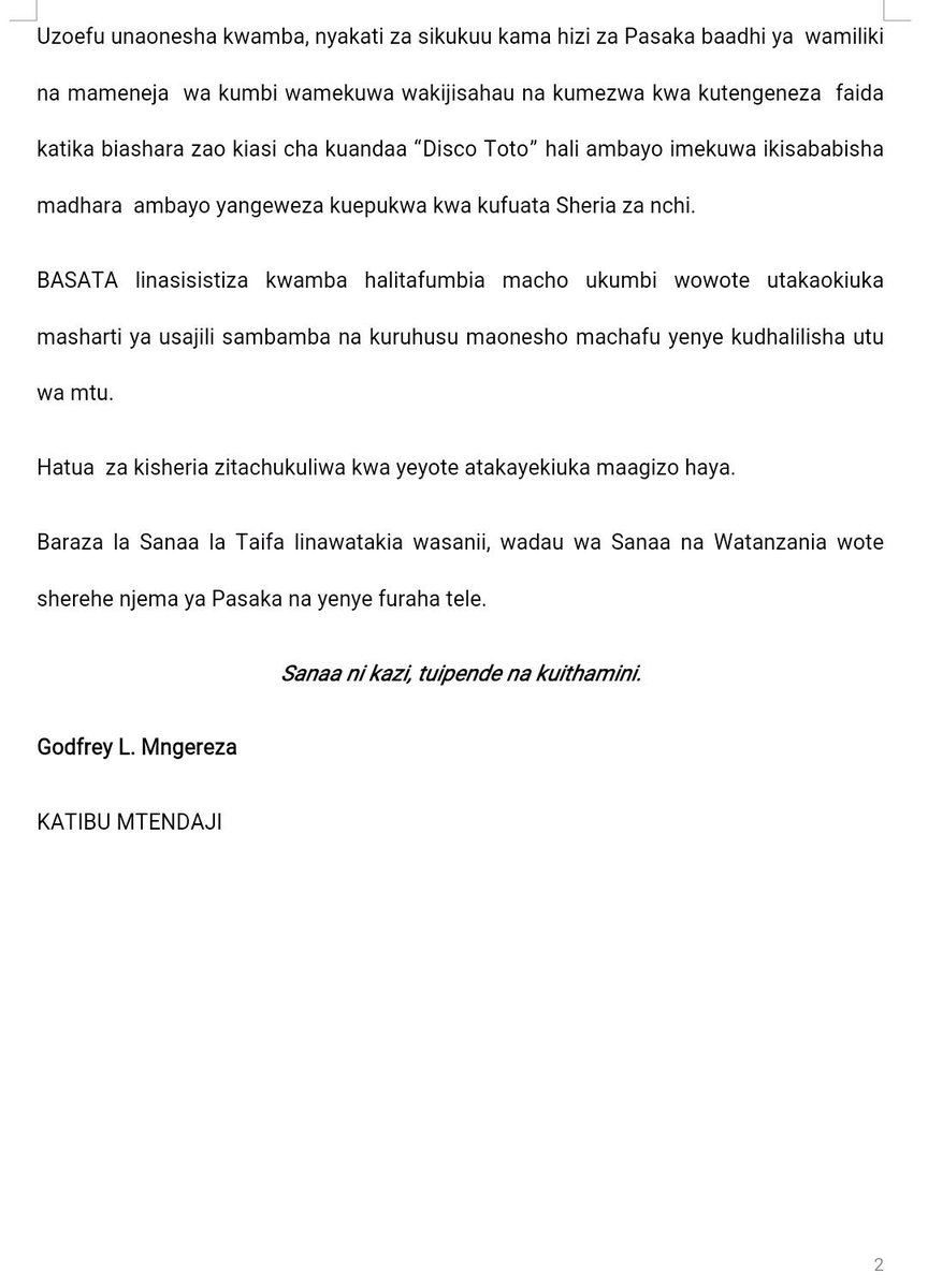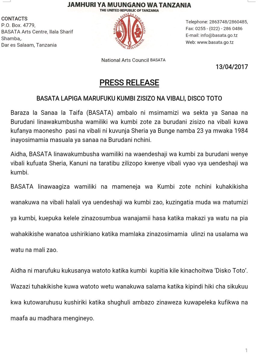 Baraza la sanaa la Taifa BASATA , Limetoa taarifa hii kwa vyombo vya habari. BASATA wapiga marufuku